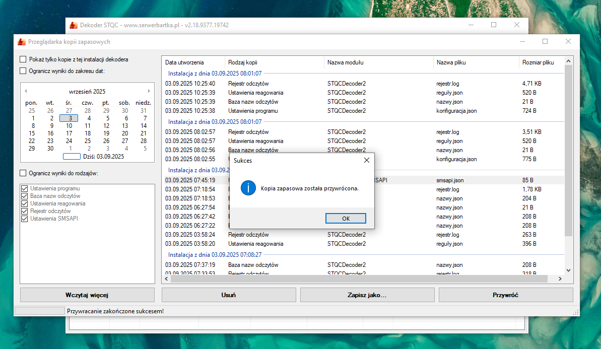 Interfejs pozwala przeglądać kopie zapasowe wg. daty z kalendarza, zakresu dat, bądź rodzaju poszukiwanej kopii. Dodatkowo program załącza do każdej kopii informację o dacie pierwszego uruchomienia dekodera w danym folderze, co pozwala wygodnie przeglądać dane wyłącznie z aktualnej instalacji.