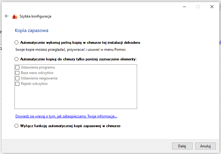 Zainteresowane osoby mogą wyrazić zgodę na automatyczne kopie zapasowe dekodera. Rozwiązuje to problemy wynikające z uszkodzenia danych spowodowane dowolnym zdarzeniem losowym: błąd programu, aktualizacja Windowsa, złośliwe oprogramowanie, kradzież, czy awaria sprzętu nie są już straszne i nie powodują utraty ciężko zbieranej kolekcji nazw jednostek. Dodatkowo zmiana komputera dekodującego będzie teraz dużo wygodniejsza - bez kombinowania z nośnikami wymiennymi.
