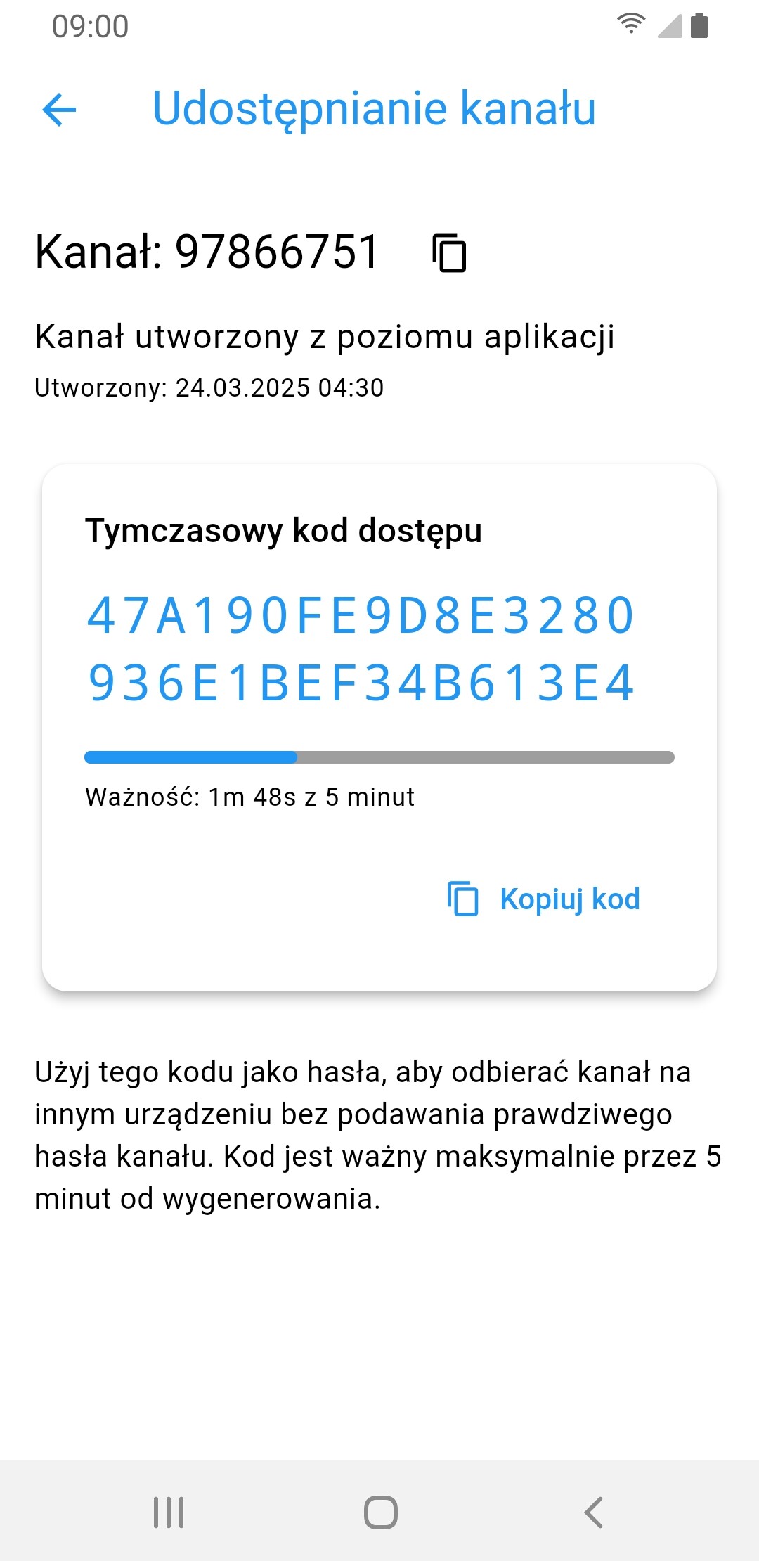 Dostajemy dostęp do specjalnego kodu, który może być ważny maksymalnie 5 minut. Możemy go wygodnie skopiować, tak samo jak numer kanału. Taki kod można normalnie podać na innym telefonie, jako hasło do kanału albo nawet użyć go w bocie na Telegramie.