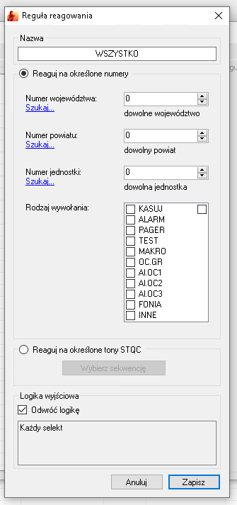 Ustawiłem wszystkie alarmy , numer jednostki 0, nr woj, 0, nr powiatu 0 a w szablonie wpisałem $kiedy, $nazwajednostki