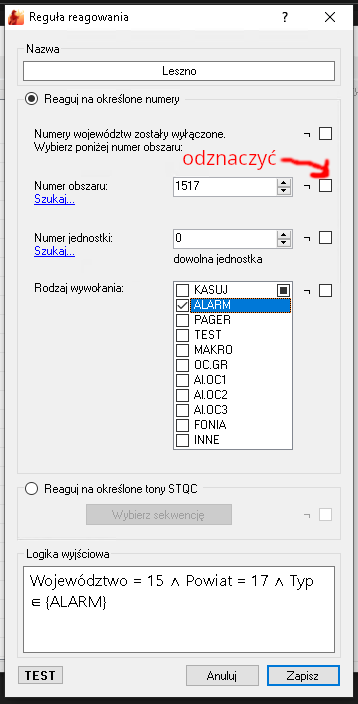 Trzecia reguła od dołu działa na wszystko z województwa 15 co nie jest powiatem 17 jeśli rodzaj selektu to ALARM, domyślam się, że zadziałała reguła na Kościan 1515 i dodatkowo ta trzecia od dołu, która działa na każdy powiat z obszarem zaczynającym się od 15.