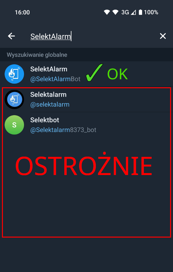 Wszystkie konta o podobnej nazwie (np. selektalarm zamiast SelektAlarmBot) mogą wyłudzać Państwa hasła do kanałów alarmowych.